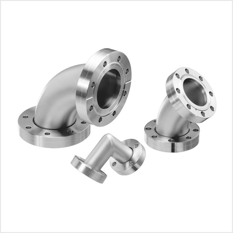 Conflat flange elbows are available in four standard configurations: 45°, 90°, 90° mitered, and 90° mitered high conductance. Specialized variations specifically within the CF elbow range include mitered angle and high conductance. A mitered angle helps with turning space and costs in constrained systems. High-conductance elbows increase cross-sectional area through the bend, minimizing flow restriction in high-throughput applications.